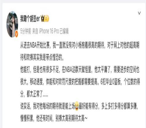 赛后,媒体人“我嘞个胡豆er”点评了杨瀚森的表现: