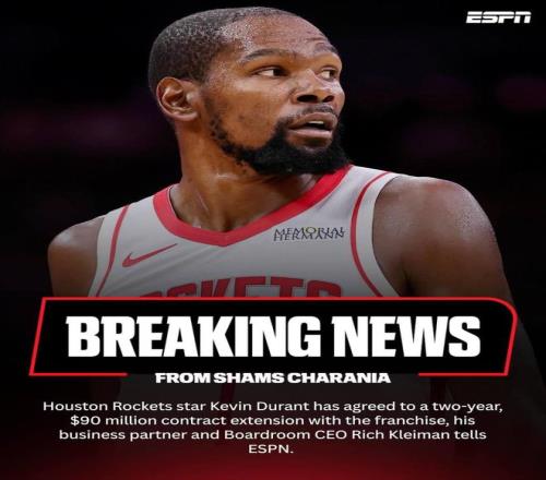 北京时间10月19日,火箭队球星凯文-杜兰特的商业伙伴兼Boardroom首席执行官里奇-克莱曼告诉ESPN,杜兰特已同意与火箭达成一份为期两年、价值9000万美元的合同续约,其中2027-28赛季为球员选项。